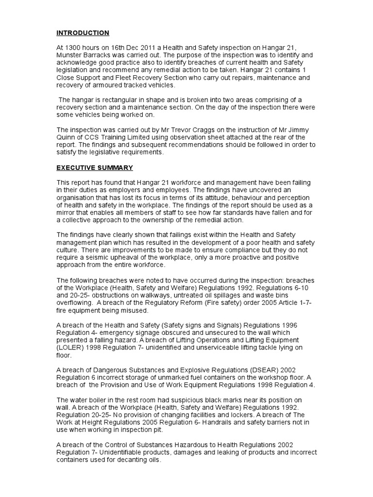 The new york state vehicle safety inspection program helps make sure every vehicle registered in this this publication highlights the safety and emissions inspection requirements for cars and light trucks. What are some ideas to write an effective report? The below narrative provides a general summary of the inspection and lists any deficiencies and/or observations noted. A safety audit report is a document where the data gathered from an audit is presented together with the record of the results of outcome of the safety audit done. Whattype of food safety inspection is conducted to ensure the establishment is built or remodeled in accordance with the approved plans and specifications? Including in the evaluation report are photos, equipment, drawing or sketch, and the overall summary report. An inspection report is a substantial document that contains the result of the property examination. The safety inspection task force prepared a report for each site, recommending actions to be taken based on their observations the summary report fulfils the requirements of the engagement letter by issuing a total of 58 general recommendations based on observations made at the inspected sites. If written inspection and audit reports document the same problems, there are other problems. Report of operational safety inspection. View, share or export safety inspection reports and summaries for the whole project or one containing items related to a specific company. Risk management quarterly building report. Details relating to the last bottom inspection can be found in the cargo ship safety construction certificate: